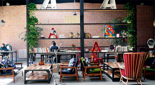 A+咖啡有着300多平米的院落,浓郁的黄色调让人觉得温暖,室内400多平米的空间全部用了透明天窗做屋顶。4米高的空间采用了工业风的装修格调,老板自己沉迷于工业风家具,这家咖啡馆完全是按照他的理想打造出来,硬朗的空间带有浓浓的暖意。欣赏咖啡馆的设计之余,点一杯老板娘精心选择的曼特宁有机咖啡豆制作的拿铁,再点一份用没有任何添加剂的面包制作的三明治,真是既饱了眼福,又饱了口福!
