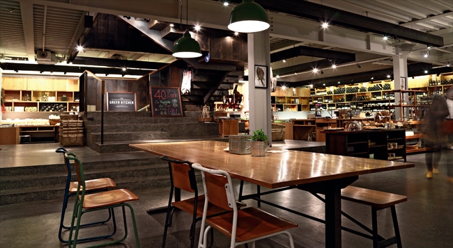 在Green & Safe,面对装置在木盒中精心摆设的新鲜食材和有机蔬菜,同样是菜场,却让人想一整天赖着不走。设计师前往小学回收大批课桌,改造成店内桌椅,并回收木窗改建成厨房与顾客区间的屏风。1 楼市集、咖啡区域和2 楼的餐饮区域由旋转木梯衔接,许多客人索性买了咖啡小食,就坐在透光的楼梯沿享受温暖阳光的洗礼。而特意凿出的1 楼外沿则方便客人欣赏街景,并不时走到旁边的菜摊挑选晚餐需要的有机蔬菜。