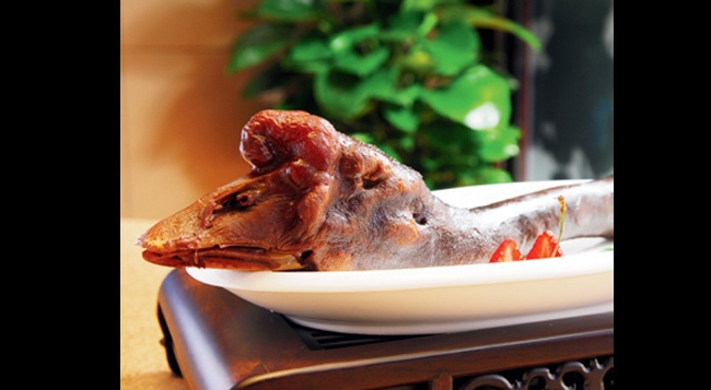 点菜之前,餐厅奉上了一些开胃小食, 都带有很浓郁的潮汕特色,特别要说一道看似不起眼的潮州芝麻糖,只看外形就已经让人判断出这里其他的菜品必然是正宗、 原味。澄海狮头鹅是这里的挑梁大菜,也是潮汕菜中极具代表性的高端菜品之一,据说这是厨师长精选上等狮头鹅的头部及颈部,用十多种名贵药材及香料,文火卤制4个多小时后的成果。鹅头入口鲜软入味,又不失应有的弹性和嚼劲,让人欲罢不能,是潮汕卤水类美食最具代表性的菜品之一,尽管每只达到人民币980 元,但仍然推荐爱潮汕菜的人非试不可。