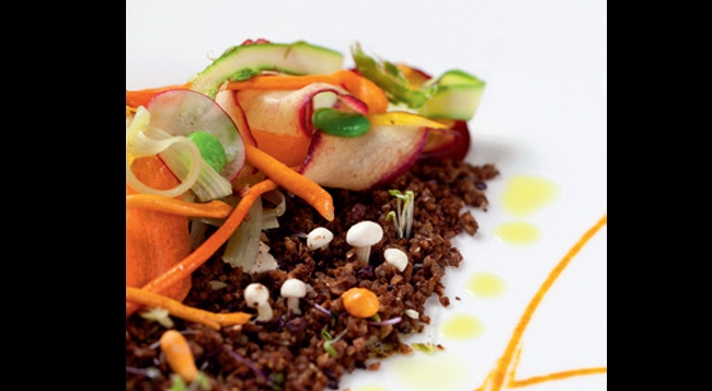 菜单上还保留着上一任主厨瑞安独创的可爱素食头盘“大地沙拉”,应合春天的万物复苏,褐色混合谷物制成的裸麦面包粒舒卷如大地,小蘑菇、各种时蔬仿佛正从泥土中生长出来一般惹人怜爱;主菜黑安哥斯牛排牛肉食材超赞,但大厨采用了将肉汁锁住不见血水的烹饪方式,而这恰恰让最向往充满血汁的Juicy 感的食客感觉不好;甜品“焦糖烩锦纹配茶味芒果慕丝及草莓冰激凌”,被加进了大黄Rhubarb 元素这个在西方常见的西点食材,在国内确很罕见。酸酸的Rhubarb 在经过小火糖浸渍翻炒之后,软软的带着酸甜适中的味道,放进了酥皮卷里,有些新意。而另一道甜点巧克力岩浆蛋糕在切开的那一刹那,岩浆已经完全呈凝固状态,着实令人有点意外。