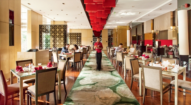 位于上海浦东香格里拉酒店内的桂花楼,设计以红黑为主色调,在黄色暖光中营造出中国传统元素与现代相糅合的用餐环境,高雅、别致又不失亲切温馨。