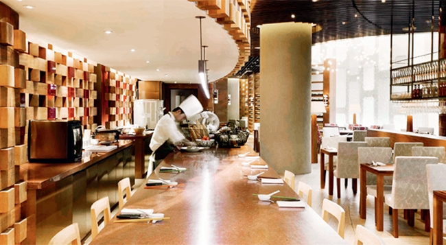椭圆形的中餐区域设有开放式厨房,如剧场般向食客展示制作过程,这里有新鲜面食、饺子和粥品制作展示区和传统烤肉展示。沪菜菜单上还有上海香糟扣肉、小笼包、龙井水晶虾仁等。另一方面,法式菜单提供各款经典的法国菜,如尼古斯沙拉、法式洋葱汤等特色高卢开胃菜;主菜包括法式红酒鸡、布吉尼翁烩牛肉和油焖鸭腿;此外还有经典永恒的甜品,如杏子塔和柠檬塔。