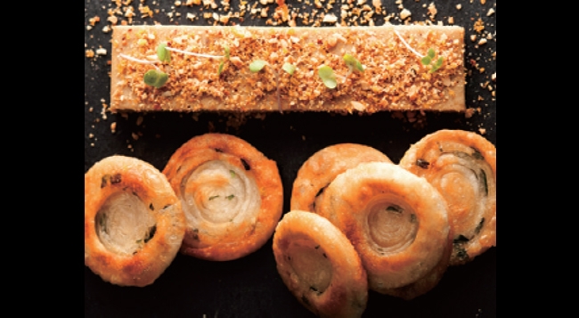 福1015的菜品不能明确去定义,能够算是中西菜式的开放式菜单,特别适合商务宴请中客人的多种口味选择——不仅可以吃到像糍饭团、赤豆松糕、眉毛酥这样的传统上海点心,也可以吃到脆皮油封鸭腿配松露汁和秘方泡菜、鲍汁煎鸭肝伴野菌这类西餐菜式。福1015的菜泾渭分明,好比“胶原蛋白炖胶原蛋白”——葱烧猪手辽参,猪手和辽参各自煨炖至酥软却不软烂甚至还带点Q劲,这两种食材的入口,吃出的是你中有我我中有你的销魂感。个别菜式依然借鉴了fusion菜的元素,比如最受欢迎的“榛果鹅肝酱伴葱油饼”—— 榛果碎仁和法式鹅肝酱与中式上海特色的葱油饼混搭,风味独特,其中唯一变化的恐怕就是为了追求视觉美感,而缩小的葱油饼的尺寸。