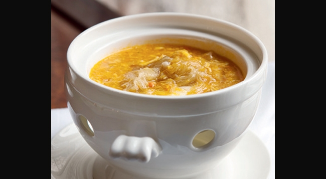 上海熏鱼,冷菜热吃,老派上海菜,用青鱼制成,甜咸适度。脆皮咸鸡其实只有鸡皮,里面则是海蜇头,两种脆不一样。莴苣寡味,沃以(花)椒油,不麻却香。鸡汁百页包太细长,鸡味已入百页中。百页包外有海带圈,养眼。汤是松茸炖野生竹荪,是菌炖菌,菌味够浓,非常清口。主菜辣酱明虾伴雪茄馒头其实就是干烧明虾,雪茄形的馒头很好玩,而且可以蘸汁吃。酸胶赛螃蟹烤鳕鱼是烤鳕鱼配蟹粉蛋,味道比较和谐。手撕豆腐是盐卤点的自制老豆腐,用以烩虾干、火腿,非常原味。火丁豌豆,也有人称之为“火末甜豆”。以前我也剥过甜豆,5斤豆剥半天,却只有一小碗,当然比豌豆要嫩而可爱。加之火末提味,小女生最爱。主食黄鱼馄饨,黄鱼肉为馅,汤中有雪菜。甜品豆浆油条可不是“四大金刚”压缩版,而是做成冰淇淋的豆腐伴着老油条,有创意。