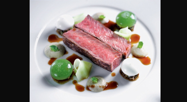 翡翠36餐厅的招牌菜“盘中的普罗旺斯”备受食客推崇,而谈及普罗旺斯的烹调特色,人们最常提到的就是橄榄油,这道菜中鲜嫩可口的煎羊腰肉,搭配秘制黑橄榄油感觉回味无穷,双色圆球则分别包裹着银鱼柳酱,帕尔玛芝士汁。这道菜的芝士汁被Franck-Elie打造成两种质地,胶状的芝士包裹液体芝士汁,轻咬一口,浓郁的酱汁即刻在口中迸发而出,惊艳不已。