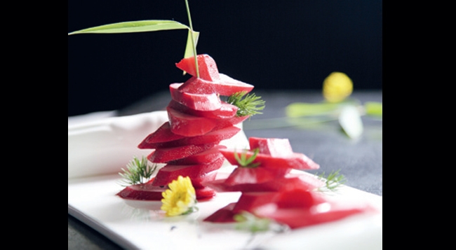 菜式主打粤菜和传统京味儿两派,一些创新菜式让人回味,不拘泥于传统的手法很新颖。比如一道红酒鲜淮山,服务员端上桌时还以为是一道蜜汁叉烧,色泽红艳,形态多汁,片成薄厚适度的斜片,如假山石般垒叠造型,简而不拙。吃到嘴里才恍然是道素食,带着淡且醇厚的酒香,滋味绵长。食物器皿也很有意思,一道和牛肉粒的盛物竟然是一块扁平的黑色山石,这是大厨自己溜达到京郊山上捡回来,又经过打磨加工消毒处理后的杰作。难得的是总体而言,外形出色颇有意境,同时食物也没有被抢过风头。自酿酸奶浓稠细腻,据服务员介绍是回头客必点的甜品之一。