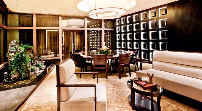 没想到这个餐厅的环境可以给人惊喜,没有常见中餐厅的呆板布局,也没有死气沉沉的大圆桌小方桌,更像是西餐厅的格局 规划让整个空间看起来闲散而舒适。还有面积不小的半开放式操作区,这在中餐厅里实属少见,也确实成为了这个餐厅内的 景观之一,让气氛通过交流而变得更加活跃。还有面积很大的一面落地玻璃幕墙,外面是垂直的景观水带,所以,尽管是位 于地下1层,但丝毫不感到憋闷。