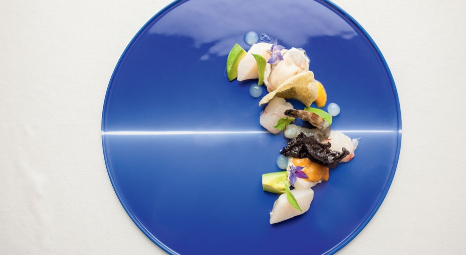 来自森林的烩藜麦搭配蘑菇、马铃薯及法香泡沫,这道作为大厨Mauro最中意的招牌菜品,“森林”菜如其名,选用各色蘑菇、藜麦、土豆以及菜叶搭配,不仅表达了森林中丰富的物产,更是惟妙惟肖地描绘出了森林中的树木、苔藓、岩石,带领着品尝它的人们徜徉于“美味”的森林之中。藏红花奶油慕斯搭配香橙冰霜及杏仁泡沫,藏红花、香橙以及杏仁等多种味道迥异的食材如一首诗中的词藻一样相互衬托、又和谐交融,层层滋味在口中融化,清爽宜人。整个甜品外形观之如云,滋味品之如饴。海鲜塔塔搭配墨鱼汁脆片及青柠,这道大厨亲自创作的冬季菜单上的“新星”所选用的主要食材全部来自大海。蓝色的盘子就像蔚蓝色的海洋,盘中那些来自海洋的丰富物产为食客们带来鲜美的口感,因此这道菜品又被称为“海洋森林”。青柠的加入则成功中和掉了海鲜的腥味,让整道菜肴都格外清爽起来。