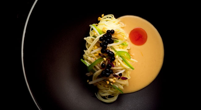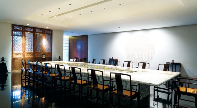 三层楼高的建筑由著名设计师吕永中设计,餐厅以木、布、石作为设计元素,以包间为主,气氛静谧充满东方禅意,让人能静心欣赏精致的素食料理。