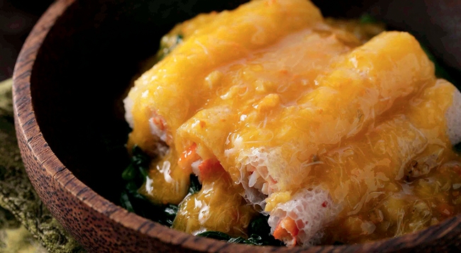 茶室中最为引人注意的是一个从山西淘得的有超过200 年历史的古董陈列架,精雕细刻,精致有加。木格子窗是拥有超过1,800年历史的老物件,按照凰庭的尺寸重新加工,雕刻精细的屏风距今也已超过100 年。凰庭的食物出品以粤菜为主,特色菜包括了蟹肉烩鱼翅、鲍鱼鸡粒蒸乳鸽以及铁观音煎银鳕鱼,广式褒汤甜美香浓,非功力深厚的粤菜厨师不能。同时食材选择出色,应季而食,是传统粤菜精神。