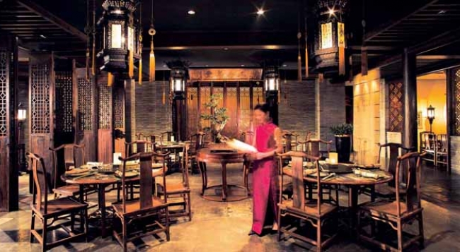 凰庭的名字与半岛酒店集团各酒店内的中餐厅如出一辙,选用了中国传统瑞兽的名称。在设计上也承袭了中国传统贵族庭院的风格,整个空间被巧妙地分割成两个区域,入口处的饮茶区及就餐区,古香古色的茶器木柜和泡茶台,让人甫一步入,就感受到浓郁的中国传统文化的意蕴和氛围。空间内大量使用灰砖墙、板石地面、松树、象牙白及蓝色丝绸等传统中国装饰材料,最为引人注目的是,餐厅内随处可见点缀其中的清朝古董收藏,真是奢华至极。