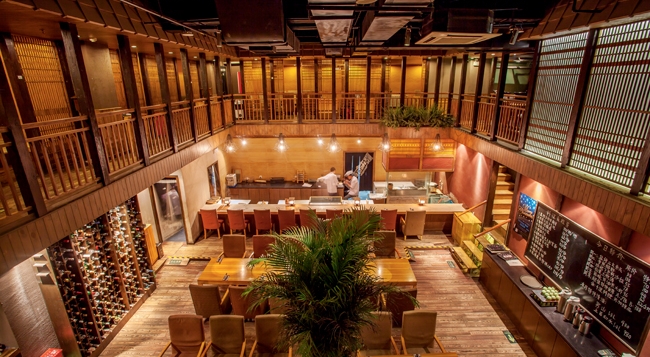 老桥场位于国贸往南600 米,原食品工厂改建,整体采用中庭造景,保留了老式房梁结构的同时突破传统的日本餐厅设计,是异域风格的环境设计和创新京都菜的完美结合。