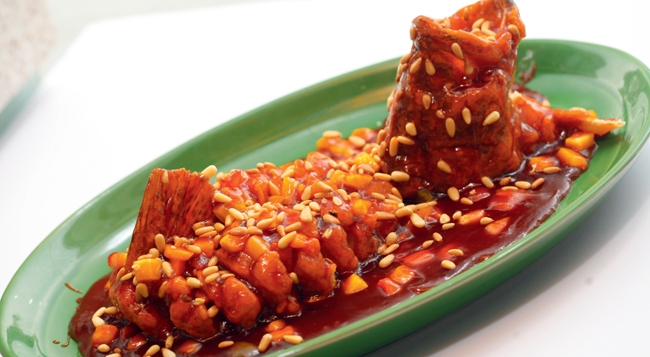 • 烤鸭烤好后,厨师会在客人的身旁将枣红的烤鸭精准地片出108片鸭肉,待到三盘片好的鸭子端上桌后,葱丝、蒜泥、黄瓜条、荷叶饼、甜面酱也将一一呈上。置于小蒸笼中的荷叶饼软糯有嚼头,更能衬出鸭肉的酥嫩。