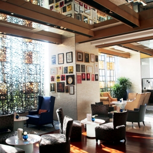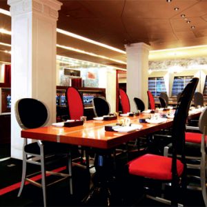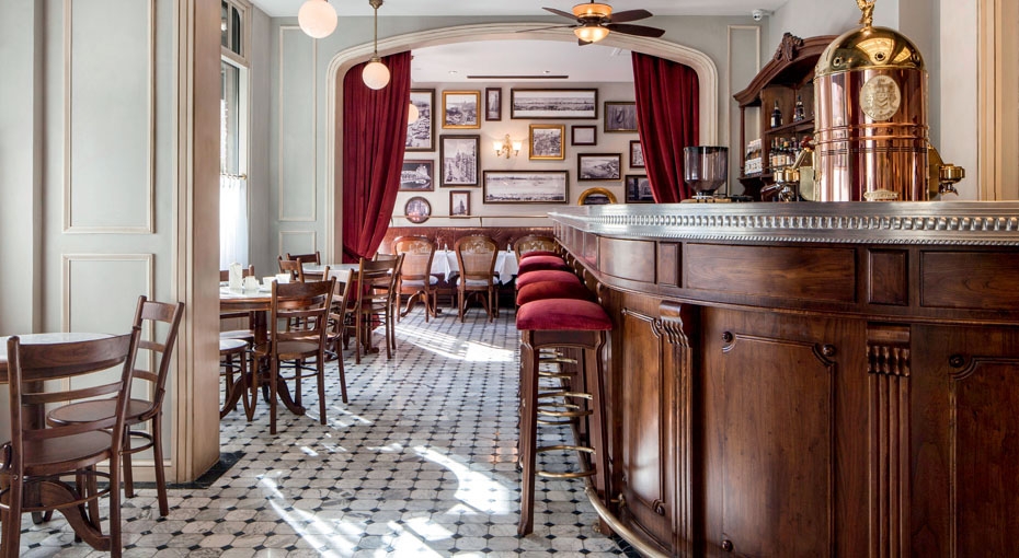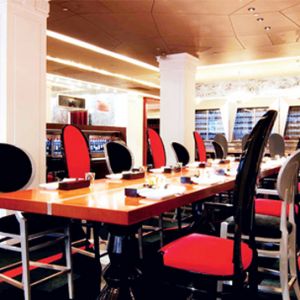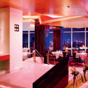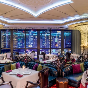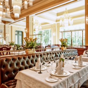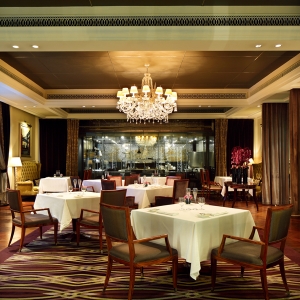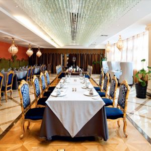 餐厅顶部的红色雕梁有着强烈的中国风格,但又与整体法式风情完美结合,再加上流光溢彩的镜面,欢快的法文背景音乐,以及餐厅里走动的服务员和法籍经理,让人有置身于巴黎的感觉。