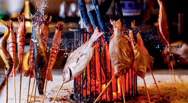 • 餐厅对食材品质要求颇高,炉端烧这一料理方式也先天地要求食材的新鲜程度。厨师将食材串在竹签上插进沙盘,根据食材特性不时转动调整,在口感最佳的时刻送到客人面前。