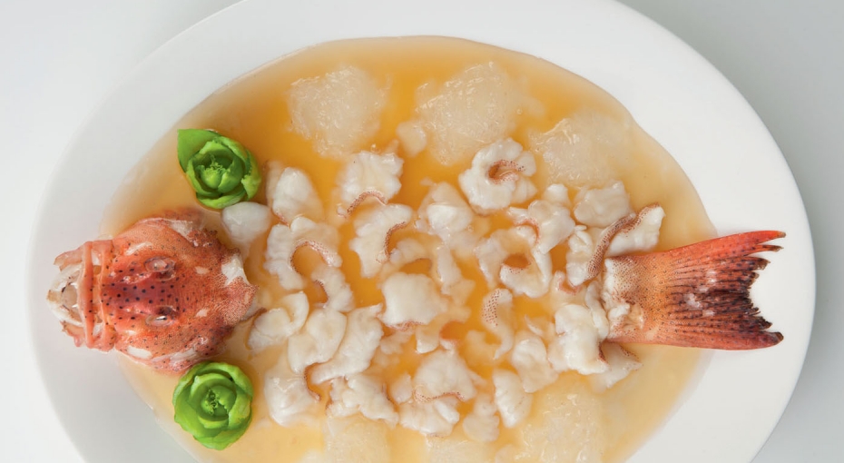 厨谭师傅的创意。凉菜中老醋海蜇头口味对路,海蜇厚身有脆性,口味鲜活。脆皮鸡选龙岗鸡,脂肪不多,肉质鲜嫩。经典粤菜中的考试菜如虾饺、炖汤、白灼海鲜、炒和牛、蒜蓉油菜,全部过硬。名菜锦绣鱼汤鲜斑球以斑鱼一鱼两吃,鱼汤鲜美无比,鱼肉嫩滑,连其中的菜心与番茄和菌菇都美味无比。