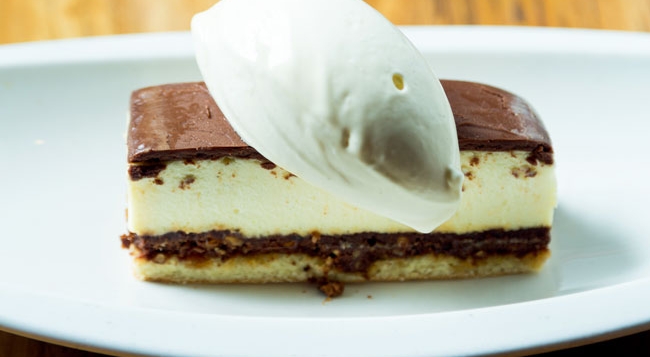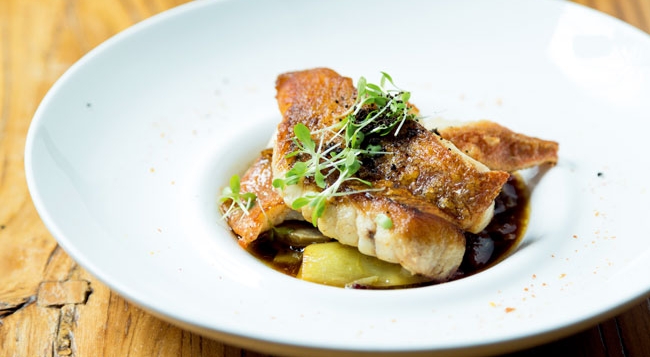•主菜方面,主厨用了许多本土肉类食材,比如猪扒、牛排以及羊排。其中最精彩的要数一道30小时慢煮猪五花肉,慢煮到肉的纤维已经完全软糯,咀嚼即化开,随之而来的便是一阵肉香。只