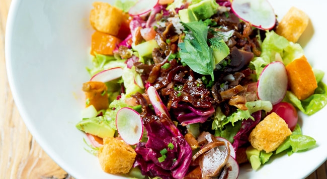 主厨Michael充分使用自己喜爱的Bistro食材,例如头盘中的温鸭胗和香脆培根和混合色拉。极少在西餐厅吃到鸭胗这类食材,在这里它被处理得很好,没有任何腥味,口感依然弹牙,和培根