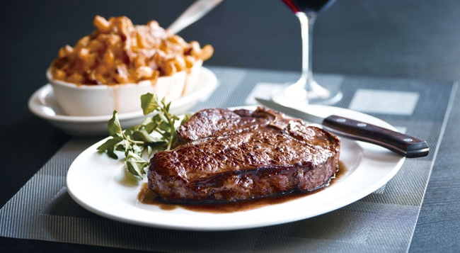 • 取自牛后腰部的上等T 骨牛排被调理得恰到好处,菲力软嫩多汁,西冷口感柔韧,带着上好肉品独有的芳香,配上烤芦笋和松露薯条,口味丰富却不简单。