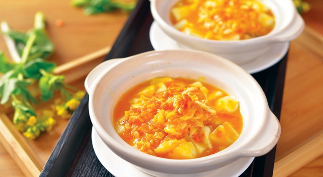 • 致真酒家每年蟹季,也是客人的飨宴开始。致真酒家精选太湖流 域的清水河蟹,除了传统方式加工的大闸蟹之外,还有自行醉制 的醉蟹,此外还有一系列蟹粉菜,比如蟹粉豆腐和蟹粉拌面。前者是用当天剥出的蟹肉煨制,以确保成菜蟹香浓郁,豆腐嫩滑。 后者同样用当天剥出的蟹粉经烹制后与鸡蛋拌面合而为一,拌面 的骨子硬扎而弹性适宜,与蟹粉融为一体,口感奇妙,为中国的 面文化提供了极佳的样本。