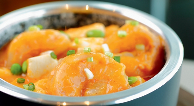 • 玻璃菊花大虾球是一道非常讲究刀工的手工菜,厨师选用顶级大 虎虾,以锯拉、拉切和滚切三种刀法,将整只大虎虾开切成如菊花般的菊花虾球,晶莹剔透,入口弹牙鲜美,菊花形状又寓意“花开富贵”,不愧为招牌菜。
