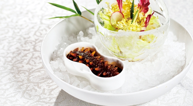 • 谭师傅传统粤菜基础扎实,他也擅用当代烹饪技术及活用世界各地食材和呈盘方式,来打造摩登新派粤菜。冰醋辽参,海参以头盘呈现已是变化,以冰醋浸慢煮海参入味来吃,清口开胃。