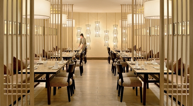 菜、淮扬菜、宫廷菜及各地名菜为主打菜系,中式佳肴美馔,缤 纷荟萃于此。一进门,首先是中式木门相迎,并有小桥、竹子、 木制屏风等,古色古香的装饰,中式韵味十足。