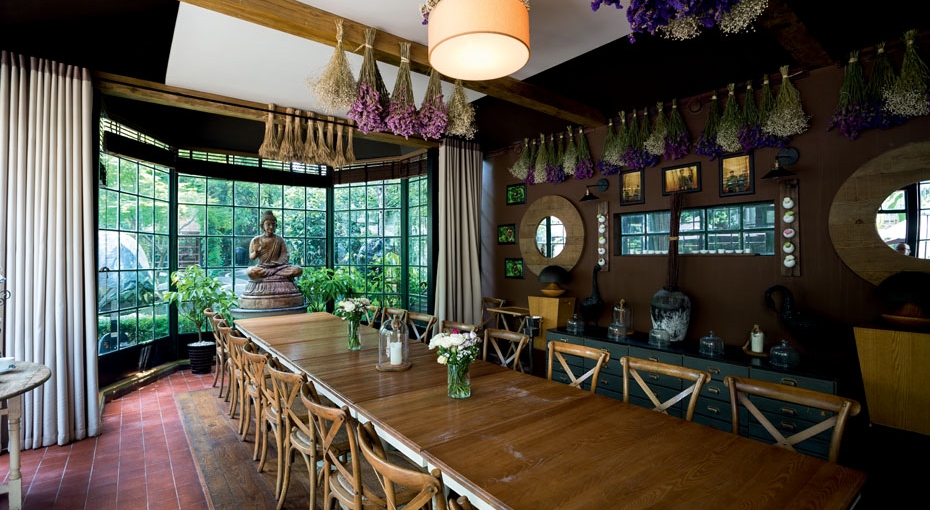 位于新华路的一幢老洋房内,白墙绿窗,梧桐树环绕,安静低调,隐秘性极好,有种法式乡村的粗犷感。往里走是法式花园和2栋玻璃屋,通透明亮,与木屋的乡野气质形成鲜明对比。